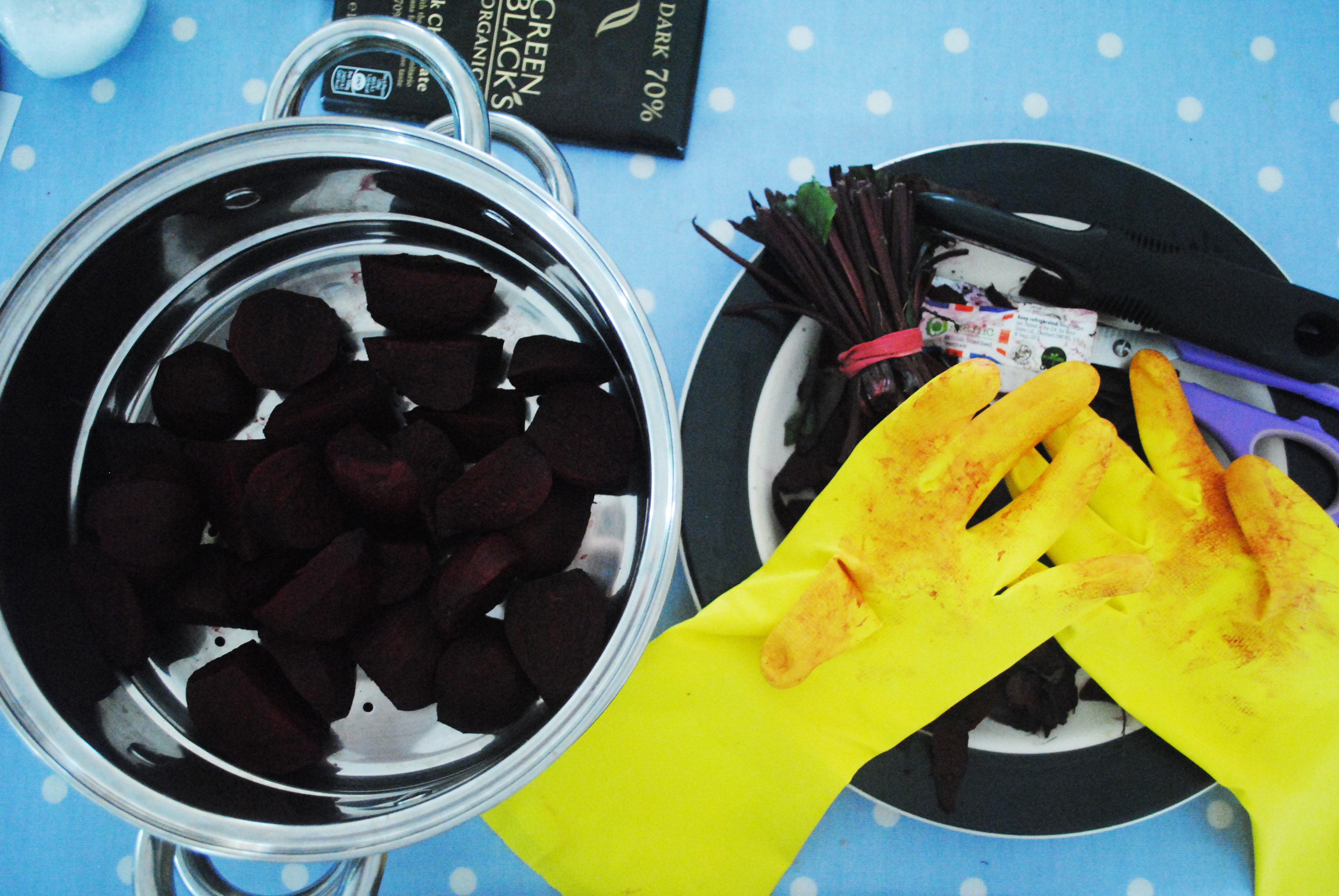 - Start with Beetroot, I pop on a pair of rubber gloves so I don’t get Beetroot stained fingers. Then peel and chop the beetroot, pop in a steamer and cook until soft.